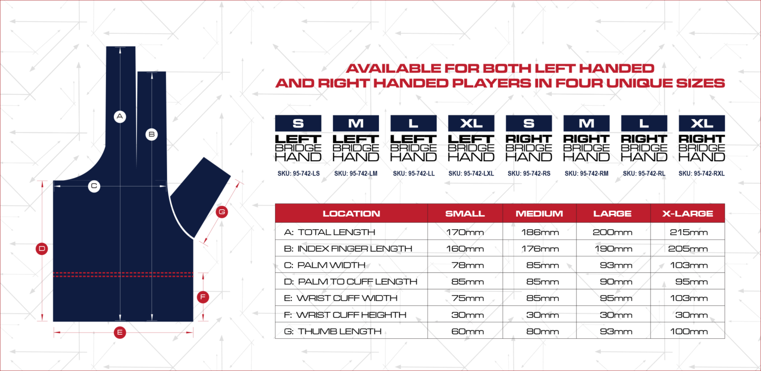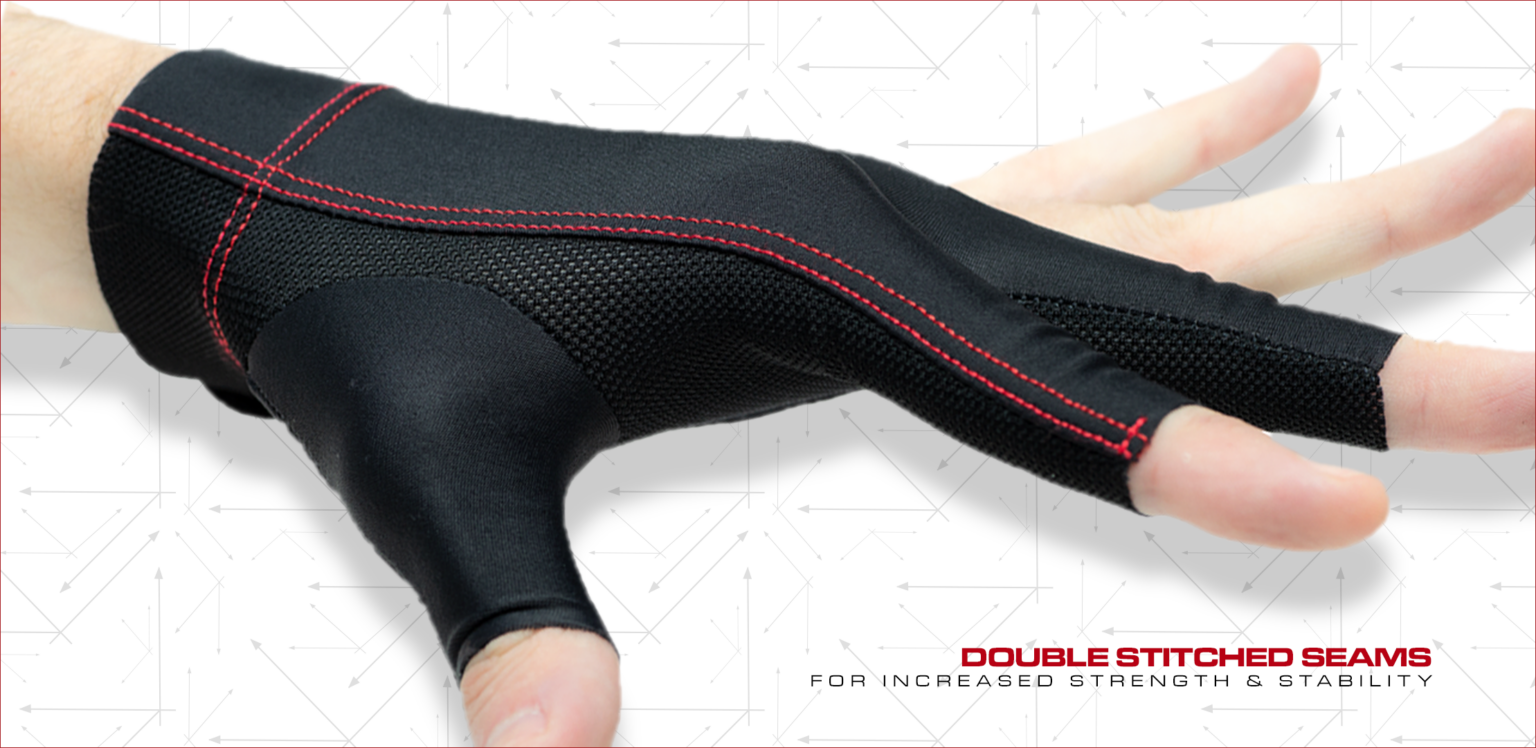 Breathable comfort from any angle. Your bridge is an important part of your game’s foundation, and on-table success is built on that same solid foundation. Axis Gloves feature a durable, ultra-low-friction surface paired with cool-flow breathable mesh that is reinforced with double stitching to provide players with a smoother and more consistent stroke. The result is a better foundation to give your game the X-factor. Axis gloves are available for either left or right bridge hands in four different sizes.